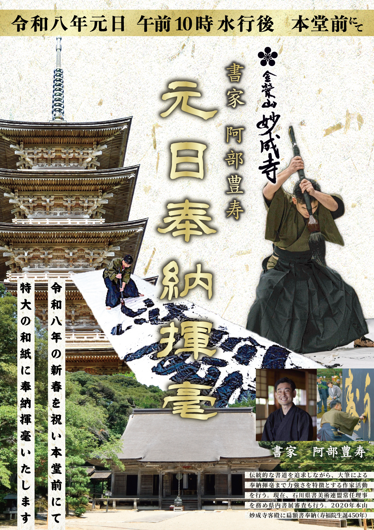 また、書家・阿部豊寿さんによる「元日奉納揮毫」が、 午前10時の水行後本堂前にて執り行われます。 気迫あふれる姿で特大の和紙に、能登半島地震の復旧復興を願って 揮毫されます。 ご参拝のおりにぜひご覧ください。